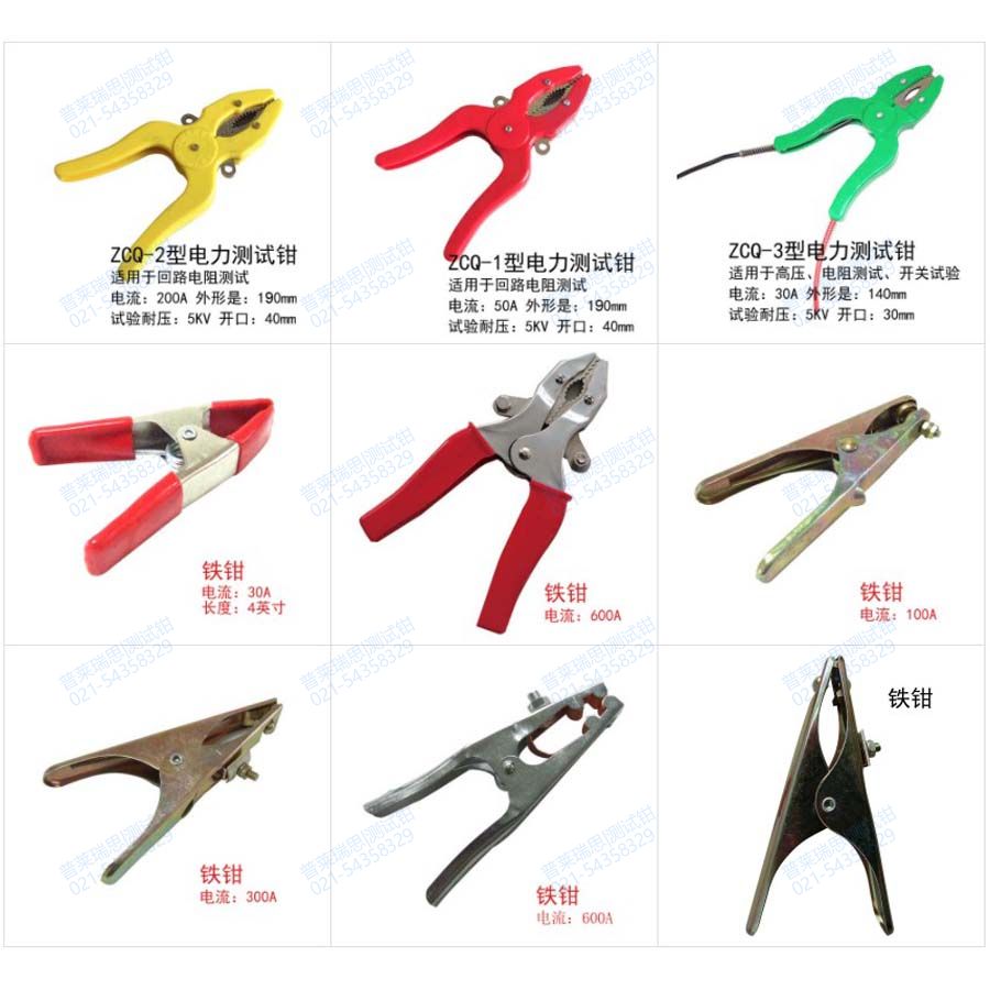 测试钳,铁钳,电力测试钳适用于测量电阻、高压断路器、变压器等仪器的测试工具;测试钳由钳架、钳口(铜质)、弹簧、大电流接线柱以及绝缘把柄(高强度的聚碳酸酯原粒子模具注塑)等组成;测