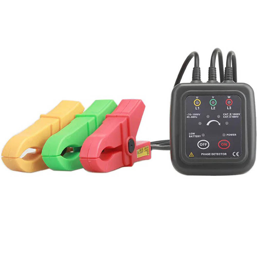 E1000C非接触相序表采用钳形非接触感应式测量,不用剥开电线,无需接触高压裸露火线,直接将三个超感应高绝缘钳夹分别夹住三相火线的绝缘外皮即可检测相序,同时声光指示三相电