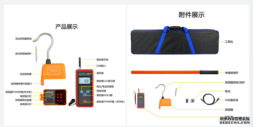 ETCR1800A无线高压验电器由接收器、探测器、伸缩绝缘杆、数据上传软件、USB通讯线等组成,测试时只需用绝缘杆把探测器挂在裸导线上,通过无线信号传输即可在手持接收器上读取电压值,一目了然非常直观,操作非常方便。无线信号直线传输距离约30米,探测器有红色LED和蜂鸣器等声光报警,使测试更简单轻松。通过USB通讯接口和上位机软件存储数据上传电脑具有历史数据查询、保存、打印等功能。